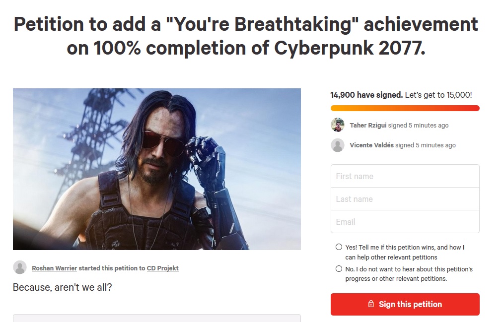 Sieć oszalała na punkcie tej wymiany zdań. Co minutę można ujrzeć nowe memy i przeróbki wideo z fragmentami pokazu nowej gry CD Projekt RED. Powstała nawet petycja o nadanie nazwy osiągnięciu, które dostaniemy za 100% ukończenie tytułu. Zdobycie tzw. “calaka” miałoby brzmieć “You’re Breathtaking”.